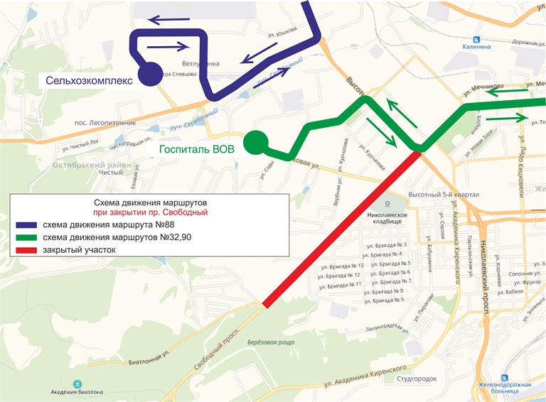 При перекрытии пр. Свободный конечная маршрутов № 32, 90 переносится к Госпиталю ВОВ на ул. Лесопарковая: пр. Свободный – ул. Высотная – ул. Крупской – ул. Забобонова – ул. Лесопарковая.