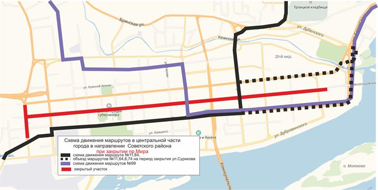 При перекрытии ул. Сурикова в направлении Октябрьского района маршруты, идущие с правого берега (№ 2, 3, 5, 36, 37, 43, 50, 55, 56, 80, 90), будут разворачиваться в районе ТРЦ «Комсомолл» и следовать по ул. Ленина.
