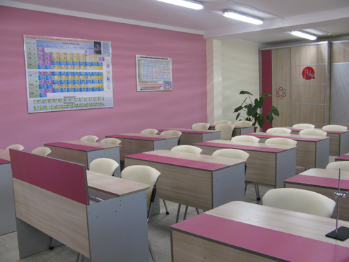 Номера кабинетов гимназии больше не нужны, классы вполне можно опознавать по цветам – бирюзовый, розовый, салатовый. Столы, стулья, шкафы - даже мотивирующие надписи на стенах выполнены в единой гамме.