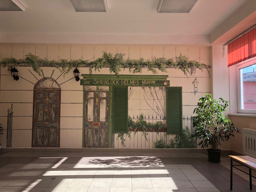 В огромных холлах школы появились стилизованные зоны отдыха. Английская улочка с красной телефонной будкой и домом Шерлока Холмса, а в галерее с панорамными окнами расставили удобные диваны и столы для ноутбуков. Для учеников начальных классов оборудовали яркую продлёнку со столами необычной формы, здесь же установили книжные полки-деревья и диван-лежанку. Столовая превратилась в кафе «100loveка» - здесь установили современную мебель, а на стенах появились грифельные доски с забавными надписями.