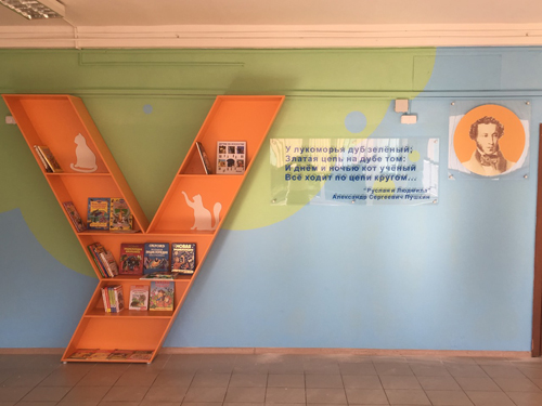 Для учеников начальных классов оборудовали этаж словесности. В холлах развешаны книжные полки необычной формы, стены «исписаны» стихами и цитатами, а дети смогут читать книги, лёжа в шестигранных креслах.