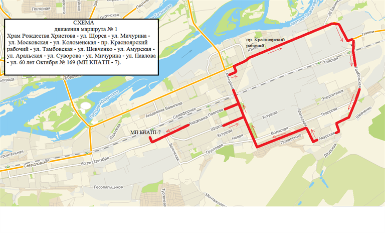 Маршрут № 1: Храм Рождества Христова – ул. Мичурина – пр. им. газ. Красноярский рабочий – ул. Тамбовская – ул. Шевченко – ул. Амурская – ул. Суворова – ул. Мичурина – ул. Павлова – ул. 60 лет Октября, д.169а (МП «КПАТП №7»).