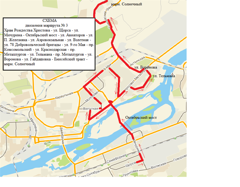 Маршрут № 3: Храм Рождества Христова – ул. Щорса – ул. Мичурина – Октябрьский мост – ул. Авиаторов – ул. Партизана Железняка – ул. Аэровокзальная – ул. Взлетная – ул. 78 Добровольческой бригады – ул. 9 мая – пр. Комсомольский – ул. Краснодарская – пр. Металлургов – ул. Тельмана – ул. Воронова – ул. Гайдашовка – Енисейский тракт – мкрн. Солнечный.