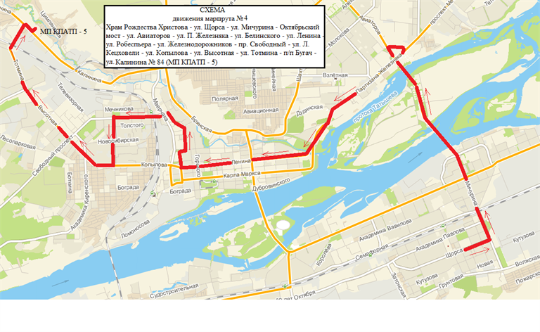 Маршрут № 4: Храм Рождества Христова – ул. Щорса – ул. Мичурина – Октябрьский мост – ул. Партизана Железняка – ул. Белинского – ул. Ленина – ул. Железнодорожников – пр. Свободный – ул. Ладо Кецховели – ул. Копылова – ул. Высотная – ул. Тотмина – ул. Калинина, 84 (МП «КПАТП №5»).