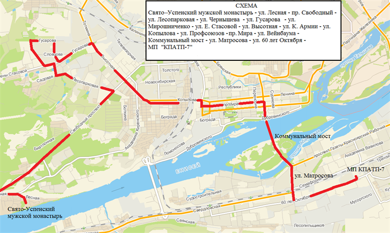 Маршрут № 5: Свято-Успенский мужской монастырь – ул. Лесная – пр. Свободный – ул. Лесопарковая – ул. Чернышева – ул. Гусарова – ул. Мирошниченко – ул. Е. Стасовой – ул. Высотная – ул. К. Армии – ул. Копылова – ул. Профсоюзов – пр. Мира – ул. Вейнбаума – Коммунальный мост – ул. Матросова – ул. 60 лет Октября № 169а (МП КПАТП-7).