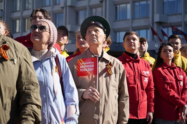 Празднование 79-й годовщины Победы советского народа в Великой Отечественной войне началось с торжественной церемонии поднятия флага Красноярска на площади у администрации города.