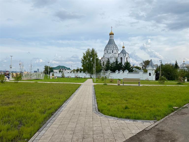 Ранее на участке располагались овощехранилища и заросли травы. Сейчас в обновлённом пространстве появились пешеходные тропинки общей площадью 793 кв. м из брусчатки, резинового покрытия, покрытия из песка и мульчи. Все красноярцы, в том числе мамы с колясками, пожилые люди, люди с ограниченными возможностями здоровья могут комфортно провести время, прогуливаясь и любуясь храмом. Через весь сквер предусмотрели транзитное движение, обустроили детские площадки и зоны событийности. Также здесь разместили арочные навесы, малые архитектурные формы для детей разного возраста, скамейки, дог-боксы для прогулок с домашними животными. Дополнительно территорию озеленили крупномерными деревьями, кустарниками и газоном.