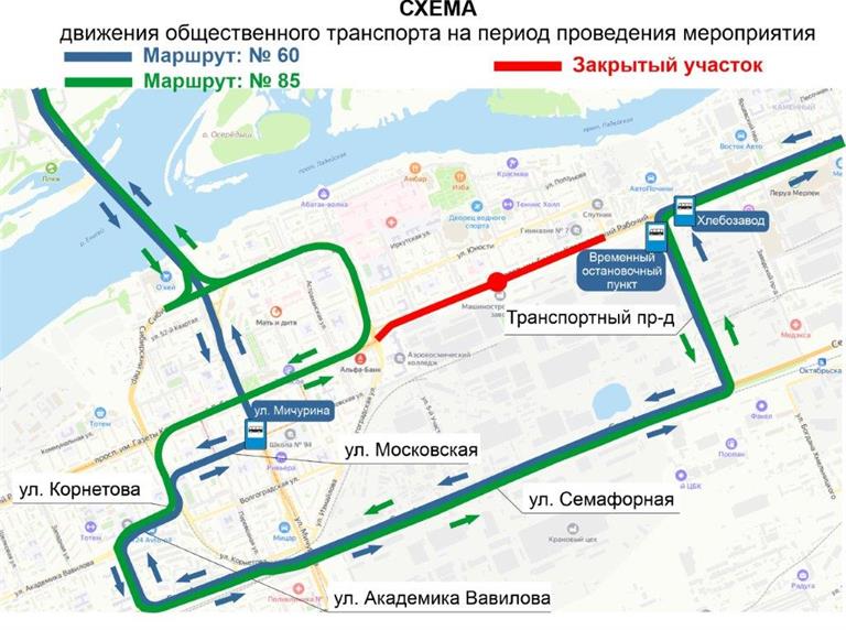 Автобусы №60 и № 85 будут выполнять движение через Транспортный проезд, Семафорную, Корнетова, Мичурина и Московскую по своей схеме.