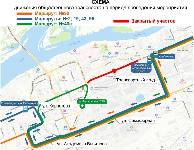 Автобусы маршрутов №№ 2, 19, 43, 90, 95, 40с для объезда участка будут использовать ул. Семафорная, Вавилова и Корнетова.