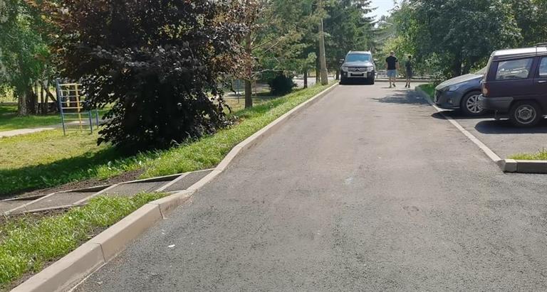 Во дворе по адресу: Академгородок, 19 средства потратили на ремонт проезда. Он был в ямах и выбоинах, теперь тут новый асфальт. Рассыпавшиеся бордюры заменили на новые.